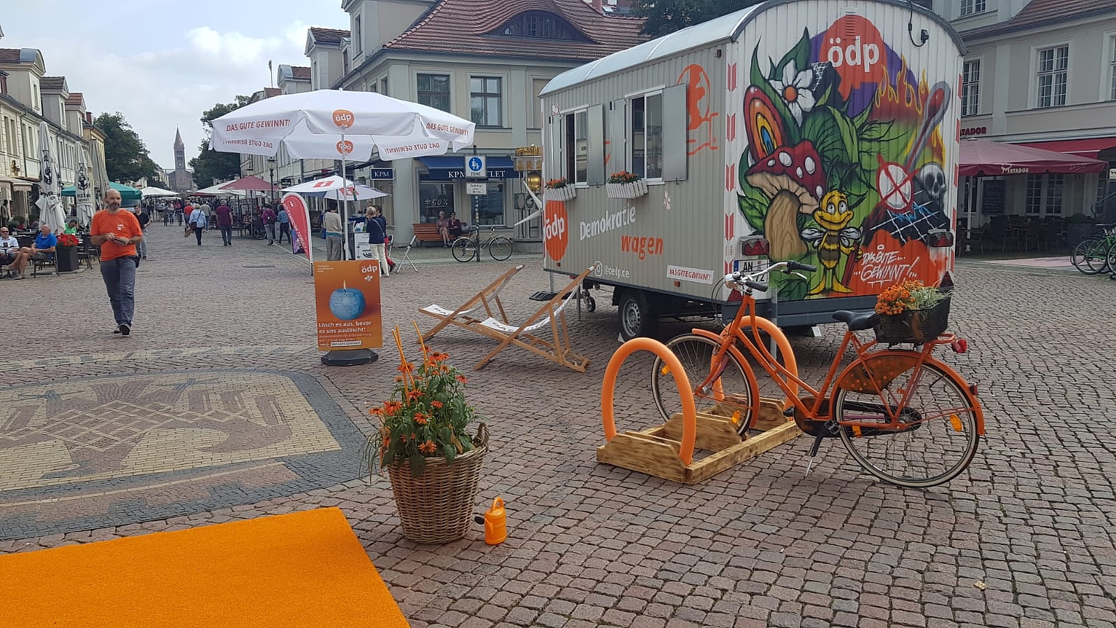 Wo immer der Bauwagen auftaucht, entsteht in den Fußgängerzonen und auf den Marktplätzen eine orangefarbene Welt: Ein großer Teppich wird ausgerollt, mit dem Fahrrad-Symbol, das in vielen Städten viel zu selten auf Verkehrsschildern zu sehen ist. Ein Fahrradständer für die Bürger steht zur Verfügung, ein oranges Fahrrad mit Blumen im Gepäckträger, weitere Blumenkörbe werden den Bauwagen schmücken. Ein echter Hingucker ist eine Terrasse, die auf der Deichsel des Bauwagens verankert werden kann – kreative Innovationen eben, wie sie auch das Programm der ÖDP bietet.