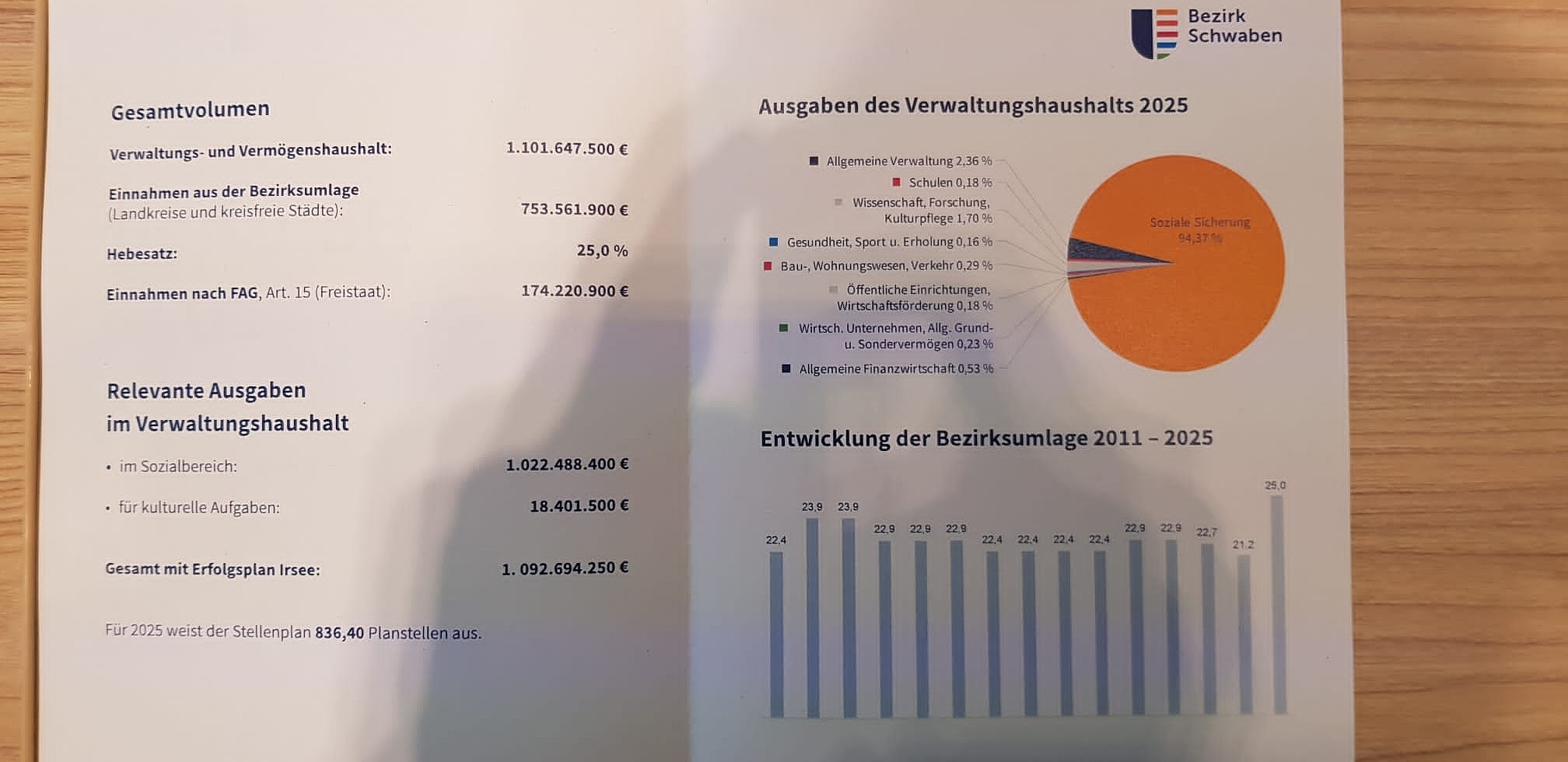 Das Jahr 2024 war herausfordernd und in finanzieller Hinsicht kamen ganz neue Dimensionen an Ausgaben auf den Bezirk Schwaben zu. Die hohen Rücklagen von fast 100 Millionen sind abgeschmolzen. Ein Nachtragshaushalt mit Kreditaufnahmen von 14 Millionen für die vergangenen Investitionen musste aufgestellt werden. Die Prognosen deuten auf höhere Ausgaben und geringere Einnahmen im Jahr 2025 hin, was die Aussicht auf ein erhebliches Defizit für das kommende Jahr verstärkt. Also sehr schlechte Voraussetzungen um in die Beratungen für den Haushalt 2025 zu gehen.